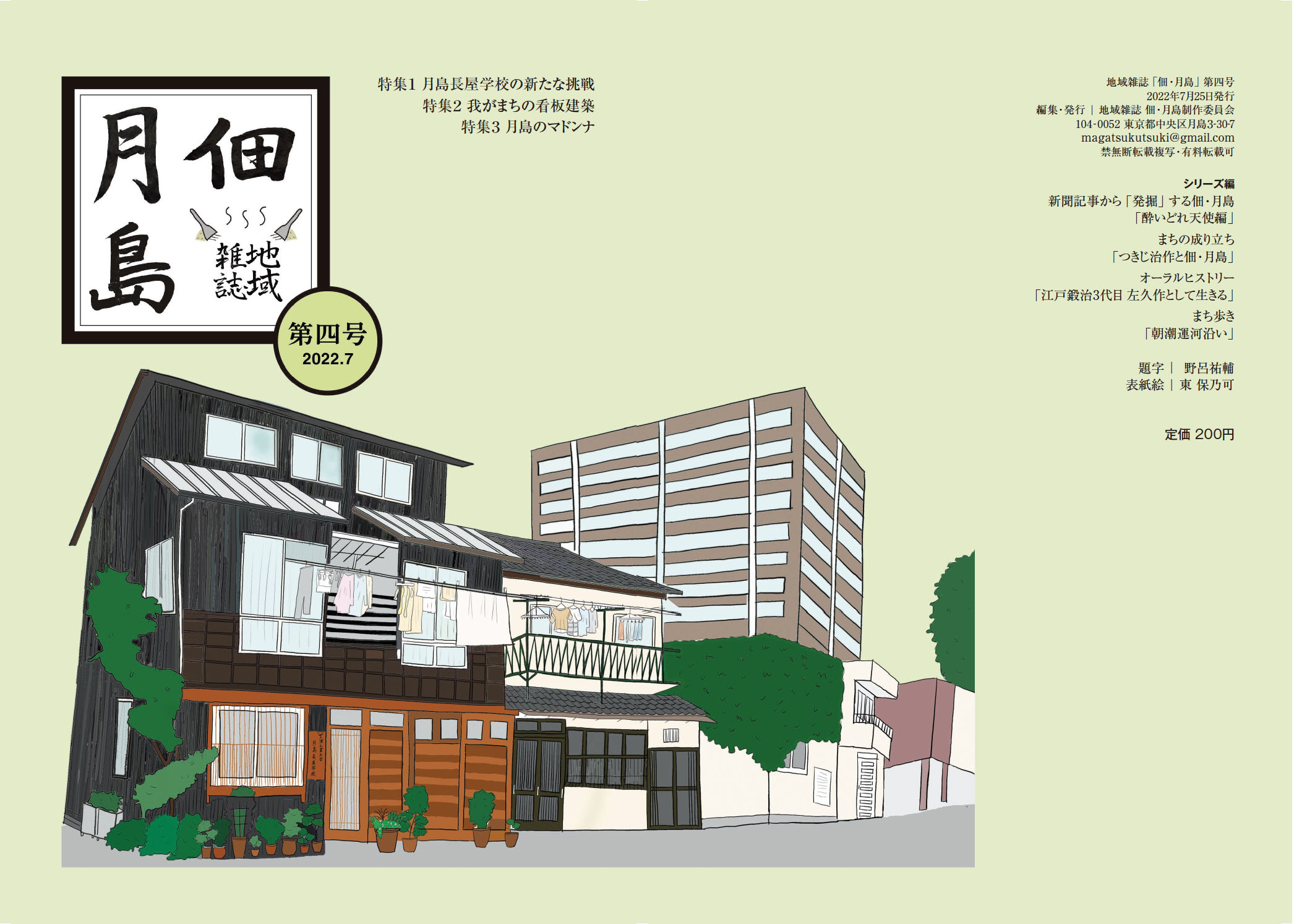 地域雑誌 佃・月島 第4号 地域雑誌 佃・月島第4号が2022年7月25日に発行されました。今回は、再開発により2022年6月に閉校した月島長屋学校の新たな挑戦や佃・月島の看板建築を特集しております。また今号は、ページ数を増やして更に充実しています。お求めは、月島西仲通り商店街3番街・相田書店まで。またはmagatsukutsuki@gmail.comまだご連絡下さい。